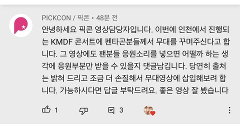 유튭에 응원법 영상 올려주셔서 펜타곤이 븨앱에서 같이 봤던 금손 유니 기억나? 거기 댓에 이런게 잇음ㅋㅋㅋㅋㅋㅋㅋ애들 무대할 때 틀어주려고 하시나?? 애들 좋아할듯 ㅠㅠㅠㅠㅠㅠㅠㅠㅠㅠ