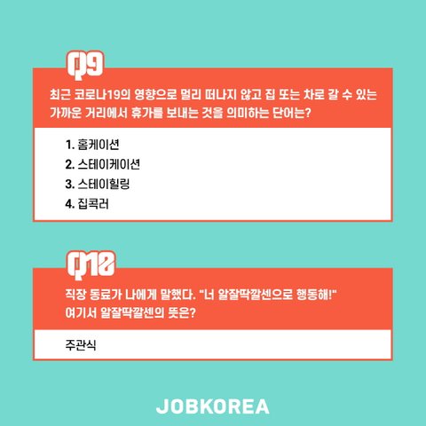 10. 직장 동료가 나에게 말했다. "너 알잘딱깔센으로 행동해!" 여기서 알잘딱깔센의 뜻은? (주관식)