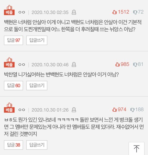 전에도 n번방 루머 퍼트리더니 백현이 인스타 스토리에 청원글 올리니까 다들 입 싹 다문 것도... sm 이번엔 제발 고소하길 바람 애초에 이번 일도 찬열 일인데 왜 찬열이 아닌 백현한테 화살이 돌려진 건지도 의문