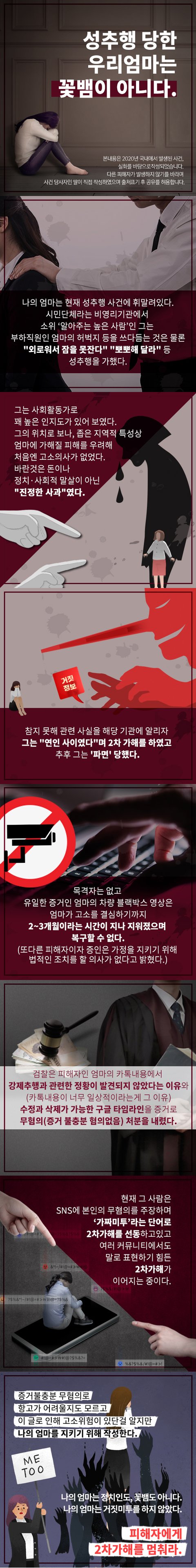 너무억울한 사연입니다..성격에 맞지않지만 결시친에 올리게 되어 죄송합니다. 저희엄마가 성추행을 당하셨어요. 가짜미투라며 가해자는 sns에서 2차가해를 선동합니다. 친정어머니 생각하면서 제발 읽어주시길 간곡히 부탁드립니다.