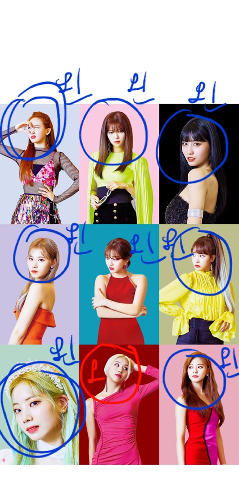 이 사진에서의 다현 방향 좀 어색. 밑에 사나랑 쯔위가 대칭 이룬것처럼 위에 다현도 지효랑 대칭으로 마주봐서 가운데로 몰리는게 안정감있는데 왼쪽 얼굴 보여주려고 지효랑 같은 방향으로 고개 돌림. 나머지 멤버들 다 미나 향하는 방향인데 다현만 밖으로 향하는 방향. -> 다현이 미나쪽 향하면 오른쪽 얼굴이 드러나기때문