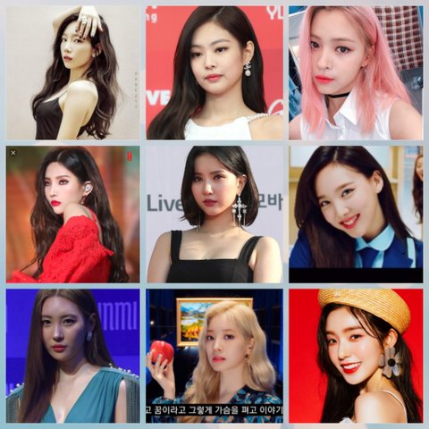 제시카 티파니 유리 선미 아이린 나연 다현 모모 사나 은하 화사 오하영 로제 제니 전소연 박초롱 정예인이 왼쪽 얼굴파고