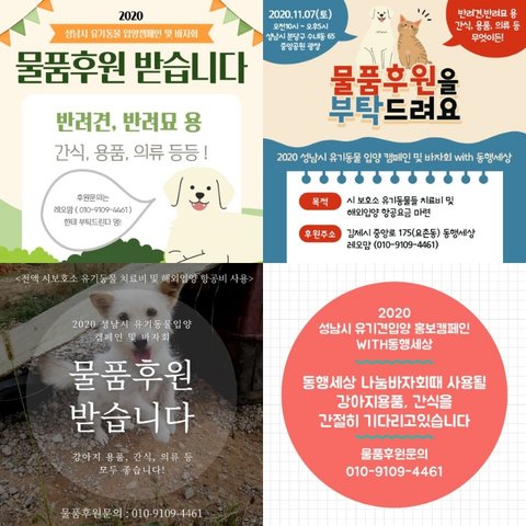 3. 동행세상 주관 성남시보호소와 김제시보호소 유기견 치료비 마련 및 항공요금 마련 나눔바자회 개최(아이들 치료비 및 항공요금 마련을 위해 강아지 관련 용품 후원도 부탁드립니다. 물품후원문의 : 레오맘 010-9109-4461)