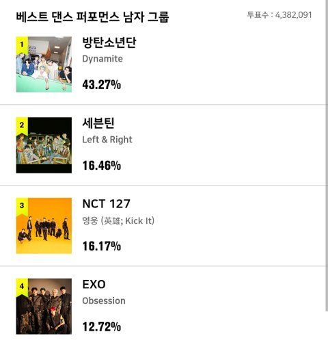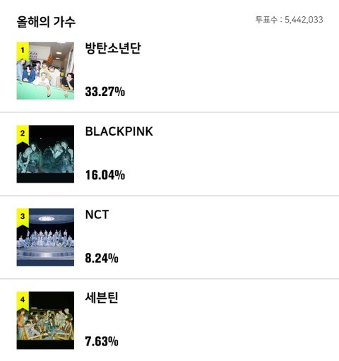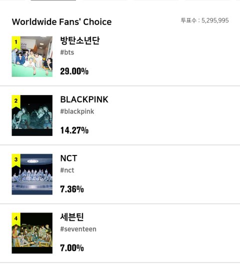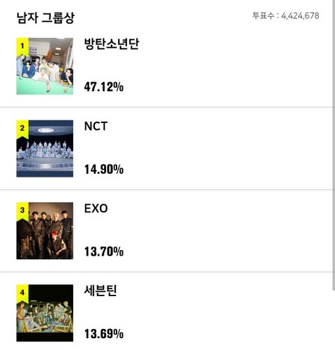 근데 이게 투표하다가도 힘빠지는게.....올해의 노래 이런거는 그래 인정이야. 다이너마이트 24힛에서 1위 지키고 그랬으니까..근데 모든 부문을 다 휩쓰는건... 왜 투표로 뽑지 싶은 부문들도 다 투표니까 힘이 빠진다는거야. 어느 팬덤이 자기 가수 안뽑겠어. 결국 모든 부문이 인기투표화 되는데 그럴거면 상을 뭐하러 주나. 그냥 인기상 하나만 주고 말지... 계정 여러개 만들어서 투표하다가 현타가 오더라. 이게 맞는건가 싶었어. 방탄이 상 다가져가는게 꼽다는게 아니라, 그냥 다 의미없어지는 것 같아