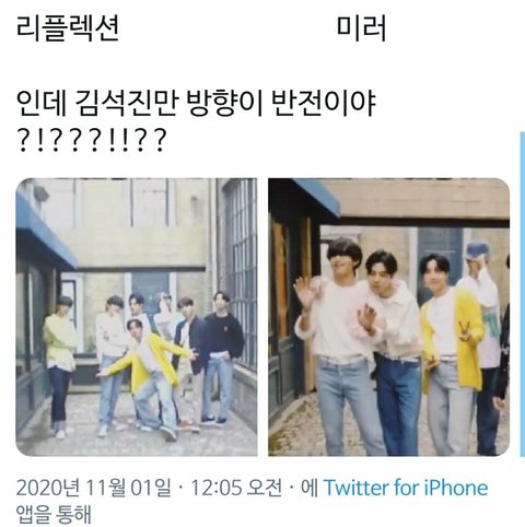 단체샷에서 석진이만 방향다름