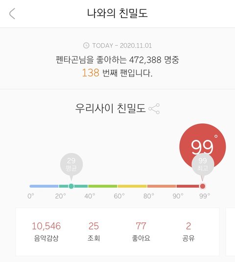친밀도 대결하자 다들 몇번째 팬이ㄴㅑ 나 6월 입덕인데 138찍엇다!!! 요즘 스밍땜에 다른 노래 못들었는데 활동 끝나면 올해안에 두자릿수 가야지 ㅎㅁㅎ