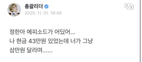 진짜 윤정한스럽닼ㅋㅋㅋ 43만원 있으면 밸런스 안 맞으니까 3만원은 그냥 달라고 말하는거 상상됨ㅋㅋㅋㅋㅋ