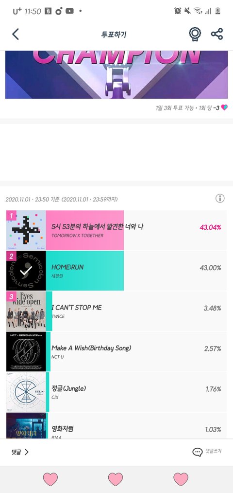 럿들 우리 쇼챔 투표좀 0.03 차이남!