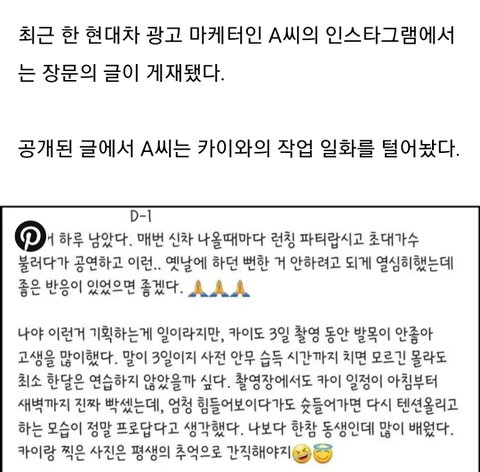 최소 3주동안 카이 유지민이 함께 스엠 연습실에서 빡시게 연습했을텐데 유지민 문자에서는 9월말 광고촬영당일에서야 만난것 마냥 친구에게 말한다는게 너무 이상함. 친구도 처음 들었다는듯이 오~ 카이 어때? 하고 물어보잖아. 그전에 연습할땐 말 안하고 뭐했대. 유지민이 실시간으로 다 털어놓는 찐친 문자인것처럼 하더니 앞뒤가 안맞음