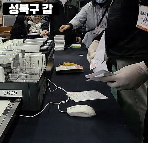 1. 붙어있는 투표용지를 전표 뜯어내듯이 뜯어내는 장면