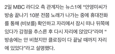 누가보면 안영미가 공사 구분 못하고 한참 라디오 하던중에 뛰쳐나간줄;ㅎ 거의 방송 다 끝나고 노래 나가던 중에 급작스럽게 소식을 들었고 너무 슬퍼서 잠깐 뒤에서 감정 추스르고 멘트만 못했지 자리에 앉아서 끝까지 있다가 나간건데 알지도 못하면서 왜저래 진짜; 꼭 저렇게까지 해야하나 저런 사람들 저럴때마다 ㄹㅇ 정떨어짐