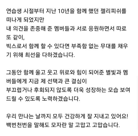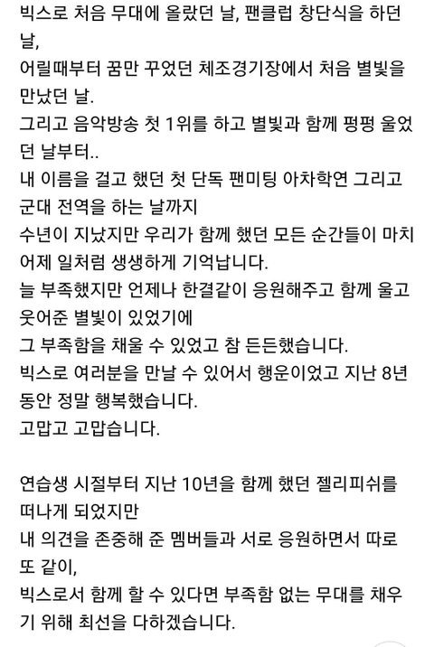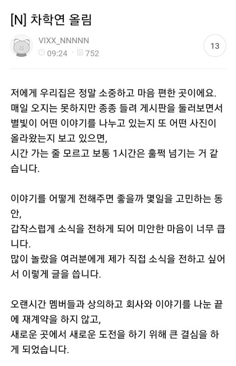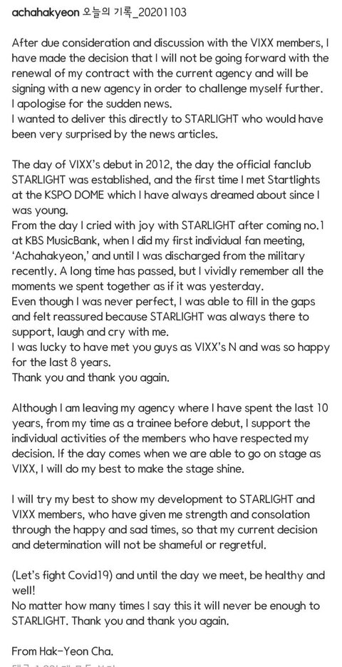 이와 함께 "8년간 함께 해 온 빅스 멤버로서, 그룹으로서 음악적 활동은 앞으로도 함께하며 지켜갈 예정"이라며 엔이 그룹 활동도 이어갈 것임을 전했다.