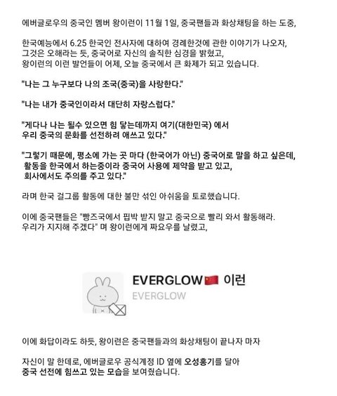 중국선전에 힘쓰고 싶은 에버글로우 왕이런