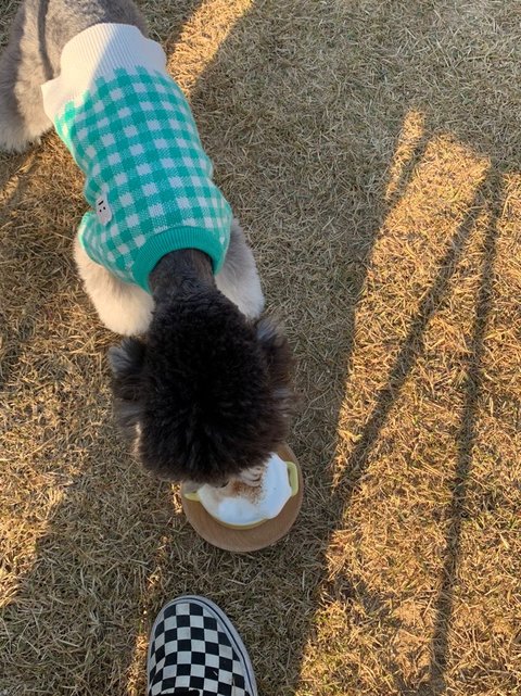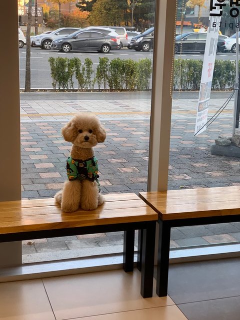 어제 야외 애견카페에 가서 가을 남자 답게 '멍푸치노'를 마시는 막내 토프