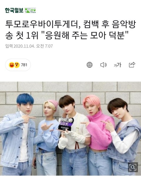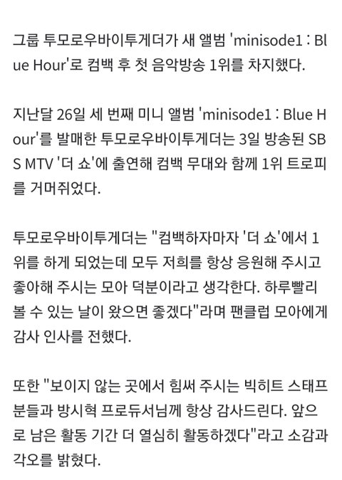 TXT 컴백후 음방 첫 1위 "응원해주는 모아덕분"