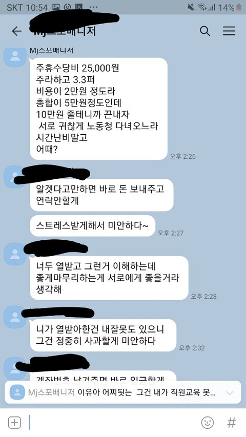 어케 생각해요?나만 돈 줄생각도안하고3주가 넘게안주다가 잔화하니니까 그때도 돈액수적게주고 지금 협박하는데 계속 밀고나갈까요?겨우 10만원으로 합의보자는데 걍 밀고나갈까요??
