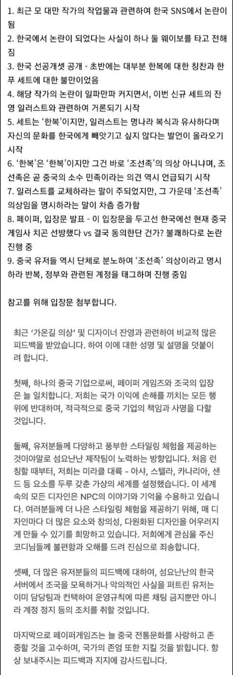 우리나라 전통의상 한복이 조선족 의상이라고 태그되고 칭해지고 있어. 다들 이 사실을 알고 이 게임을 불매해줬으면좋겠다.. 중국에선 이미 꽤 판이 커졌나봐ㅠㅠ
