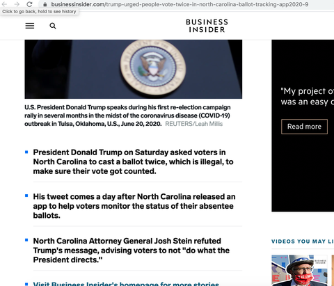 https://www.businessinsider.com/trump-urged-people-vote-twice-in-north-carolina-ballot-tracking-app2020-9게 우편 투표 하지 말라고 함