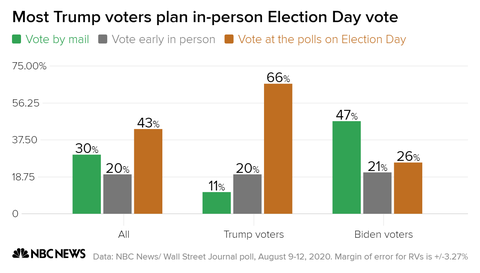 여기서 중요하게 알아야 할 사항은몇주, 아니 몇달전부터 트럼프는 자기 지지자들에게 우편 투표 하지 말라고 했고그래서 아래 그래프 에서 보이다 시피 트럼프 지지 자들은 우편 투표를 별로 사용하지 않음.