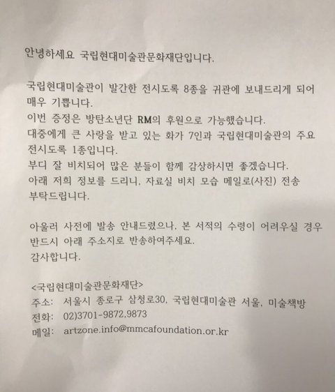 이는 지난 12일 RM의 생일을 기념한 선행으로, 국립현대미술관이 출간한 미술 도서를 중심으로 절판돼 구하기 힘든 도서 및 재발행이 필요한 도서 제작을 후원한다. 제작된 도서는 전국 400곳의 공공도서관 및 도서산간지역의 초·중·고 학교도서관에 기증한다. 또한 국립현대미술관 미술 책방에도 비치하여 누구나 구매할 수 있도록 한다.