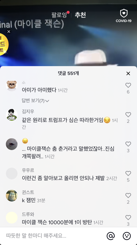 아니 틱톡을 다마노래에 마이클춤 비슷한게 나왔다고 댓글니 저상태임...아 화낼필요없는데...생각없이 욕한거여서 더빡침..하 거르자