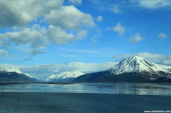 스워드에서 출발한 기차가 앵커리지를 향해 달려가고 있습니다.