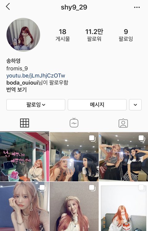 아직 만든지 얼마 안 돼서 파란 딱지(?)는 없지만 프나 공계가 팔로우하고 있는 실제 본인계정 맞아! 난 여돌 공계, 개인인스타 구경하는거 좋아해서 프로미스나인 공계 팔로우하고 있었는데 송하영 사진의 느낌을 되게 좋아해서 개인계정도 팔로우했어 아직 사진이 많은편은 아니니까 송하영 피드가 마음에 들었다면 프로미스나인 계정에서 사진 보는것도 좋을것같아 ( officalfromis_9 ) 아이디 안 가린건 프로미스나인 샵 쌤이셔