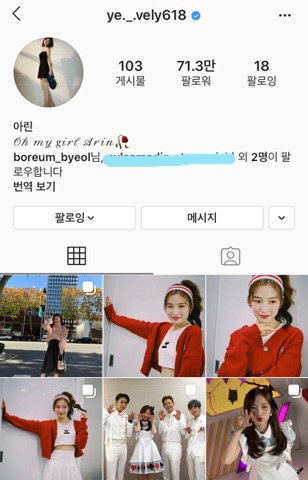 아이디 가린건 교차편집 유튜버분이고 안가린건 같은 멤버 아린! 속상하거나 안 좋은일 있을때마다 들어가서 피드를 보는편이야 항상 웃고있어서 막 나까지 기분 좋아져! 최근에 피드정리 하신듯ㅠㅠ 내가 진짜 좋아하던 흰 상의 하이 입고 포니테일하고서 대기실 의자같은곳에 앉아있던 사진이 사라졌어ㅠㅠ 캡쳐해둬서 괜찮긴한데 피드에서 보는 그 맛이 있걸랑ㅠㅠ 혹시나 찾는 사람 있으면 알려줘 댓글에 올려둘게