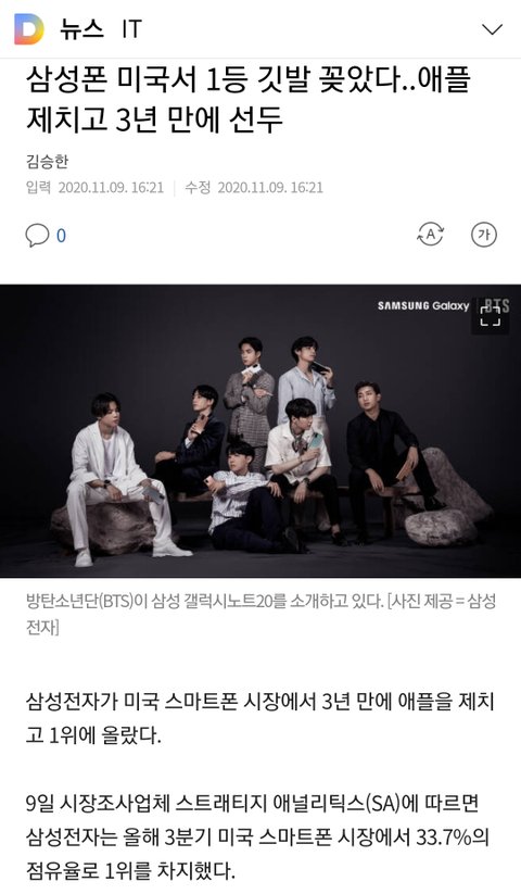 방탄 덕은 아닌 듯 삼성은 삼성 자체로 해외에서도 잘 나가지 않나