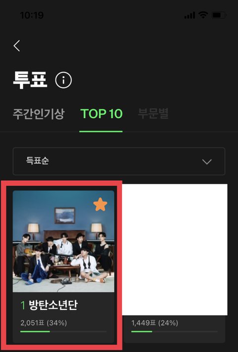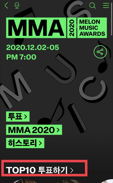 빨간색 박스를 따라가면 멜미유 탑 텐 투표가 가능함! 이용권 있는 사람은 매일 3표, 없는 사람은 매일 1표 가능함!!! 간 김에 주간인기상 투표도 하고~~~~~~