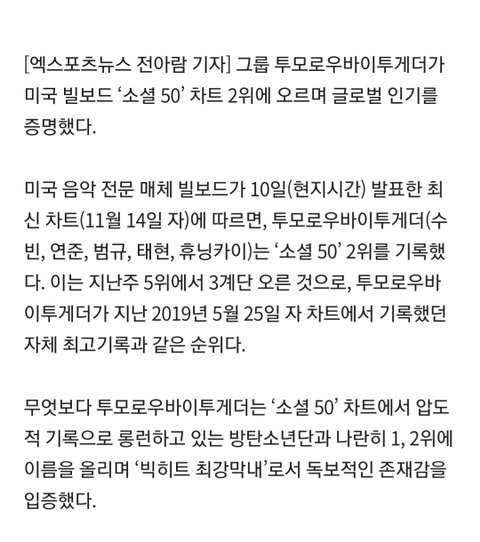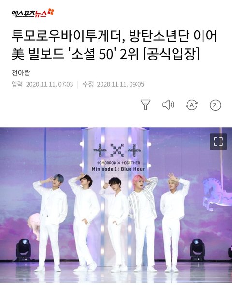 TXT ㅂㅌ에 이어 미 빌보드 소셜50 2위