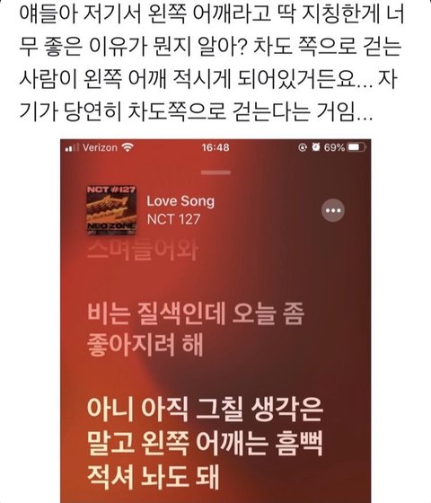 나는 드컴투, 낫얼론처럼 미래에 관한 얘기 이런 노래도 엔시티 노래라면 다 좋아하고 즐겨 듣는데 썸이나 연애 대상을 전제하고 쓴 가사가 담긴 노래들을 좋아하거든! 잘생기고 목소리도 좋은 애들이 이성의 입장에서 노래를 불러주는 느낌이 좋아서! 그래서 우산, Back 2 U, 123, 아 깜짝이야, 댄싱인더레인, 백열등 이런 노래 같은 현실 연애 노래들이 많이 나왔으면 좋겠어...