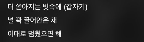 댄싱인더레인도 최애곡이 우산인 나한테는 우산 2탄으로 느껴졌거든! 우산은 뭔가 썸타는 이성이랑 더 붙어있고 싶다는 마음이라면 댄싱인더레인은 '더 쏟아지는 빗속에 널 꽉 끌어안은 채 이대로 멈췄으면 해' 이 부분을 들었을 때 사귀는 이성이랑 빗속에서도 더 같이 있고 싶은 마음이 느껴져서 ♡