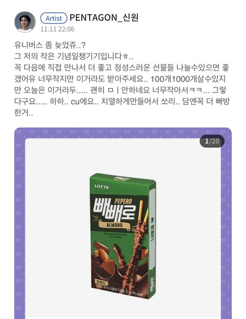빼빼로데이라고 팬들한테 전부 못주니까 20장 기프티콘으로 결제해서 유큐브에(팬들과 소통하는곳)에 올려준 신원이 신원이 안사랑하는법좀 알려주세요ㅜㅜ 덕후들아 ㅜㅜㅜㅜ 이거봐ㅠㅠㅠ