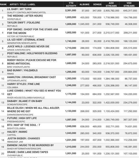 이거는 올해 미국에서 백만 장(실물 음반 판매량이랑 음악/비디오 스밍이랑 노래 세일즈를 합산한 앨범 판매량 수치)을 넘긴 앨범 순위인데 이중 방탄이 16위를 했대