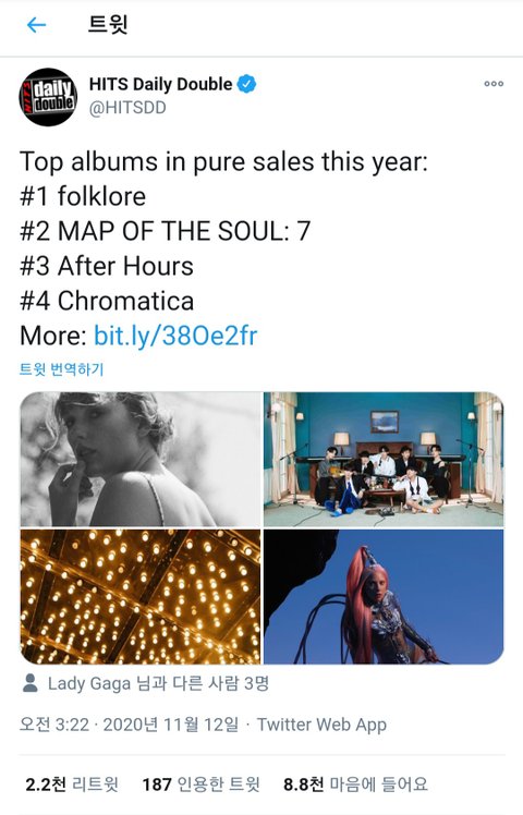 심지어 올해 가수 순수 판매량(실물 음반 판매량이랑 스밍 수치만 합산한 음판)은 미국에서 2위...