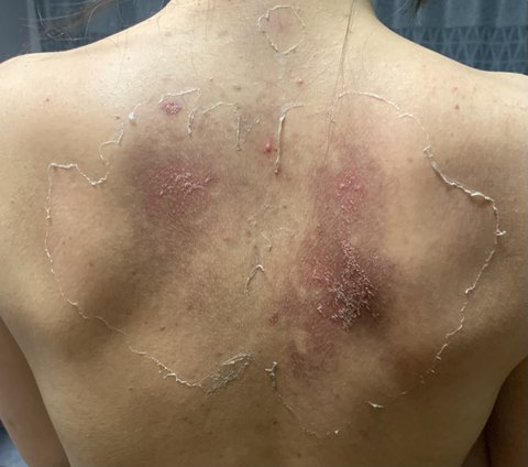 통증과 따끔거림으로 인해 똑바로 누워서 잘수도 없고 붉은 자국그대로 딱지가 다 앉았으며 통증이 심해 피부과에 내원하니 화상처럼 보이나 화상으로 진단할 시 비용이 많이 비싸지니 접촉성 피부염으로 진단 후 레이저 치료와 연고사용 약을 복용 하고 있습니다ㅠㅠ