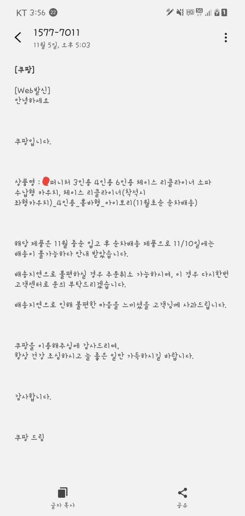 11/5 배송일을 확인하고자 X퍼니처 고객센터에 4차례 전화를 하였으나 연락이 되질 않았고, 그래서 쿠팡에게 전화를 하였습니다. 쿠팡에서는 해당 판매처와 통화를 하고 아래 문자를 보내었습니다.
