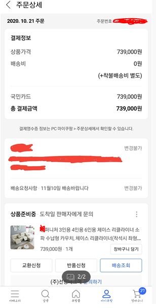 이때부터 당황했습니다. 아니 내가 돈을 내가 구매를 한 소파를 언제 받을수있는건지 왜 안내를 못해주는건지...?