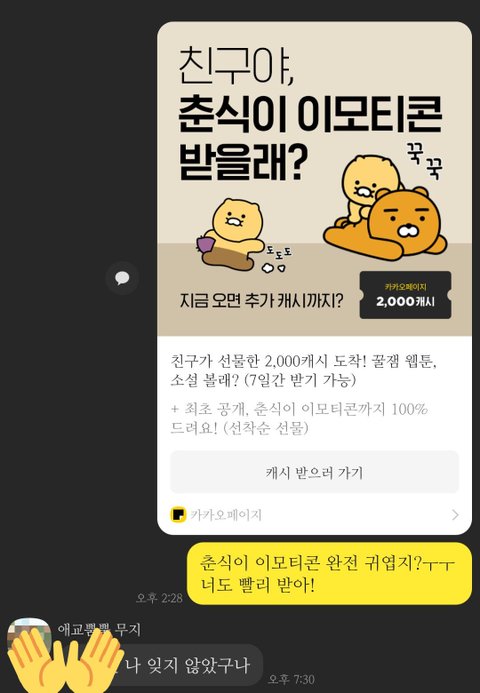 ...근데 사건은 여기서부터였어. 애가 집에 가고 몇 분(?) 안 지나서 톡이 오는거야 고모가 도착했다고 보낸건가 싶어서 봤는데... 음.... 그래....전남친한테 '○○○ 나 잊지 않았구나' 이렇게 온거야. 와 진짜 그 순간 무슨 용긴지 모르겠는데 대화창을 열었다..? 맞아, 저 이상한 사진이 내 사촌동생이 뿌리고 떠난 대환장파티 선톡인거지... 어떻게 들어간지도 모르겠고,, 왜 굳이 저걸 보낸지도 모르겠는데.. 나 어떡해?
