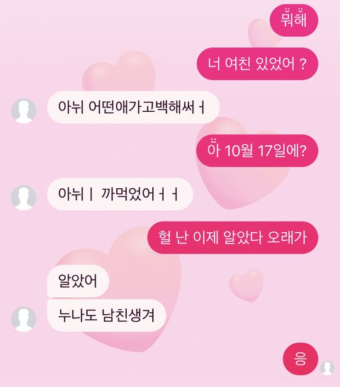 걔한테 뭐하냐고 펨을 보냈는데 걔가 또 안읽씹을 해서 그냥 걔 프로필 염탐을 했음 근데 걔가 같은중 여자애랑 연애중이 떠있는거임 ㅈㄴ 당황했는데 날짜를 보니까 10월 17일이라는거임 ㅋㅋㅋ 와 그래서 나 혼자 ㅈㄴ 빡쳐있다가 페메 내용을 위에부터 읽어봄 근데 나한테 폰압된다고 하고 나 차단했을때가 10월 17일이었음 그래서 여친있었냐고 물어보니까 둘러대는게 보이게 답을 함 ㅋㅋㅋ