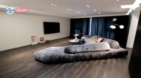 카이 집 블랙 그레이톤으로 카이 이미지랑 잘 맞는것같음 저 대형 소파가 작아보일 정도로 거실이 운동장이여