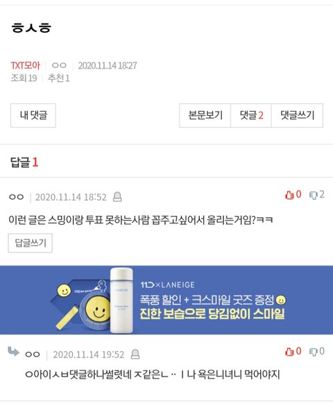 투표안해? 안하면 싸물고있어 투표하는팬 업고다녀도 션찮을판에 이게 머선개솔이고? 쥰만한새기 여기왜왓으까?