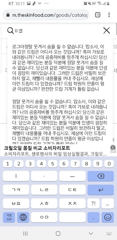 아까 그 스킨푸드 7000원 행사한대서 제품 살려고 스킨푸드 홈페이지 들어갔었거든? 쨌든 슼푸 홈페이지 들어가서 립 앤 치크라고 검색할려고 립 앤... 이런 식으로 검색하고 있었는데 앤 이라고 타자 칠 때 갑자기 뙇 하고 긴 글이 순식간에 0.1초도 안되서 바로 사라졌었단 말이야? 엇... 이게 뭐지? 하고서 다시 립 앤... 이러면서 검색했는데 또 지나가는거야 그랬는데 너무 글 내용이 궁금해져서 '립 앤' 치고 스크린샷 '립 앤' 치고 스크린샷 계속 반복하다가 한 16번째? 쯤에 글 캡쳐에 성공했어!