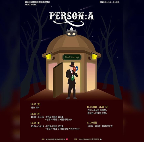 안녕하세요! 숙명여자대학교 홍보광고학과에서 직접 기획하고 운영하는 PRADWEEK를 소개해드리고자 합니다. PRADWEEK는 매년 하나의 주제를 선정하고, 주제와 관련된 다양한 프로그램을 진행하는 학과 내 최대 행사입니다. PRADWEEK는 올해로 11주년을 맞이했으며 매년 높은 참여율과 주목을 받아왔습니다. PRADWEEK 기간 중에는 광고제, PR 전시회, 실무자 특강 등 다양한 프로그램들이 한 주간 진행되며 PRADWEEK의 하이라이트인 홍광인의 밤 행사로 끝마칩니다. 올해는 코로나19로 인해 PRADWEEK가 전면 온라인으로 진행될 예정입니다! 오프라인이 아닌 온라인으로 이루어지는 만큼, 숙명여대 홍보광고학과, 혹은 광고나 PR에 관심이 많은 학생 여러분들은 부담 없이 구경하고 가세요!