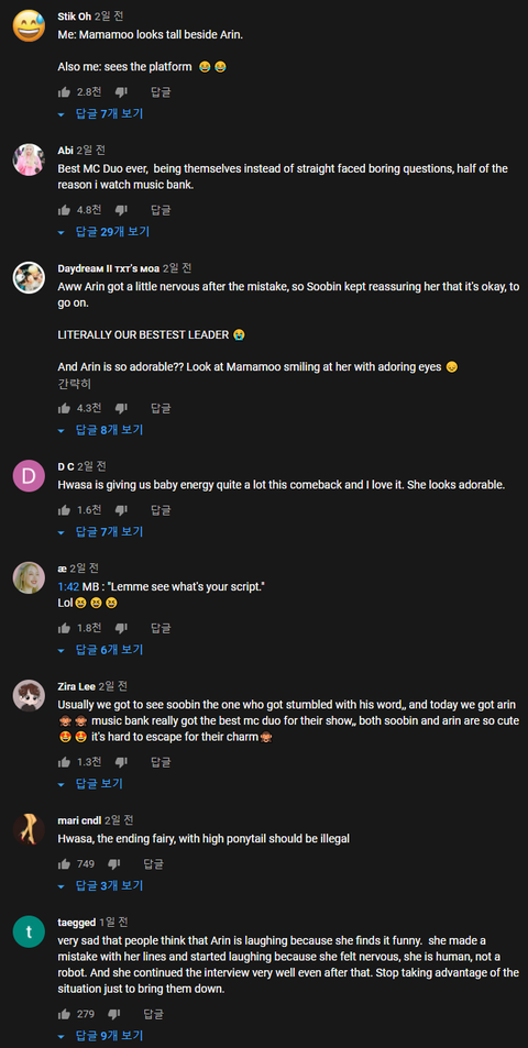 평소에 아린이도 수빈이도 실수 종종있었는데 서로 실수할때마다 나머지 한쪽 잘 이끌어줘서 정말 귀엽고 보기좋은 MC라고 칭찬함.