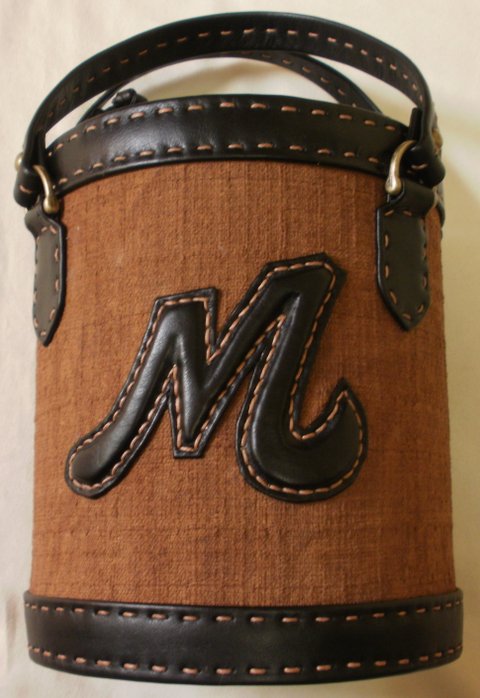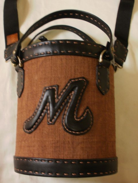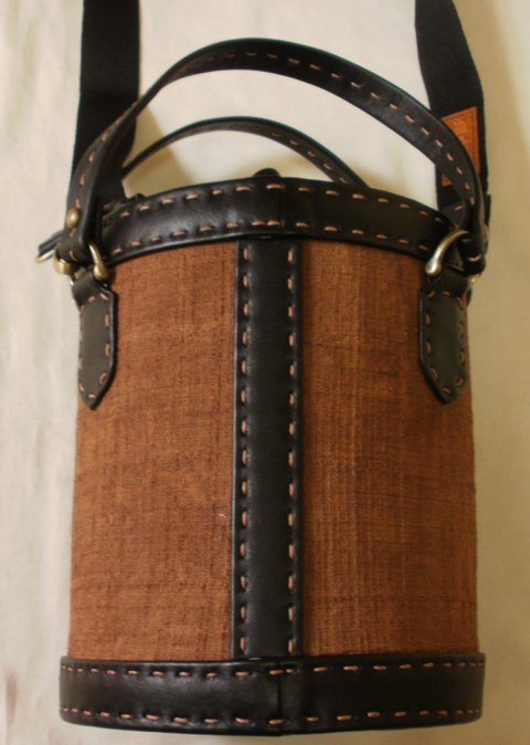 천연가죽과 천연염색한 원단을 콜라보하여 수작업으로 제작한 핸드메이드 원통형 메이크업백(화장품가방)입니다.(마디샤가죽공예)
