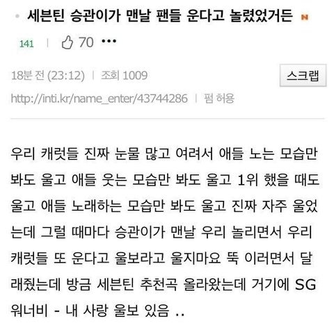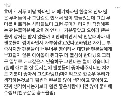 ++ 난 그냥 자기 본진들 팬사랑 자랑하자고 글 올린건데 자꾸 내 본진이 망돌이라느니 그러는거 진심으로 기분 나빠,, 이쁜 마음 나누고 있는데 분위기 흐리지 말아줘...