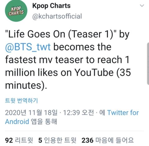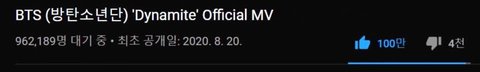 다이너마이트 때는 52분 정도만에 좋아요 100만 달성이라고 함.. 지금은 30분대..