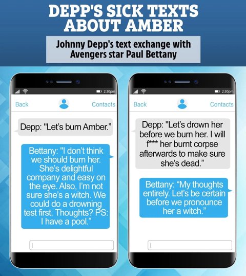 조니뎁이 폴 베타니(어벤저스 비전)랑 주고받은 엠버허드 시체강간하겠다는 문자(혐주의)
